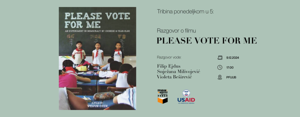 Drage studentkinje i studenti PFUUB i USAID/Serbia pozivaju vas na decembarsko izdanje tribine Ponedeljkom u pet, koje će se održati 9.12.2024. godine (ponedeljak) u 17.00.časova (velika sala, I sprat, PFUUB), na kojoj će biti prikazan dokumentarni film „Please Vote For Me“, mini eksperiment o demokratiji. Reč je o dokumentarnom filmu koji, prateći izbor predsednika odeljenske zajednice […]