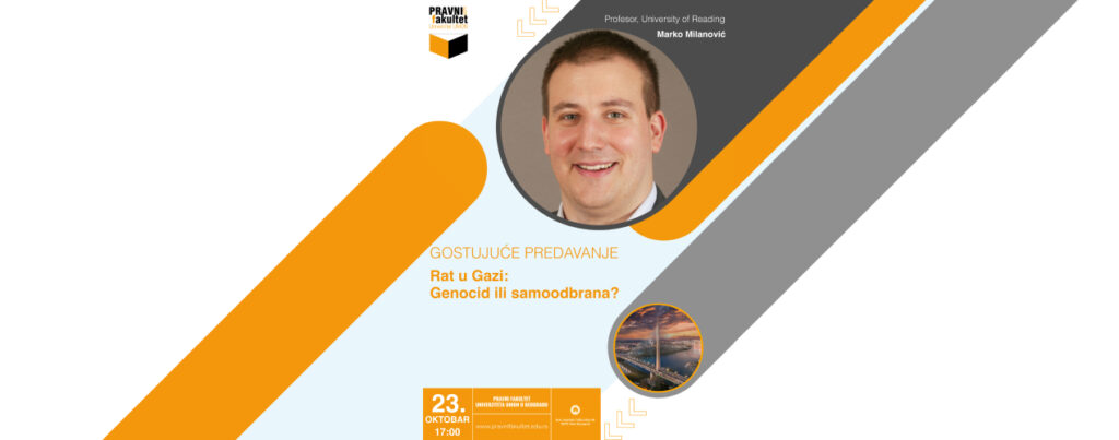 Poštovane koleginice i kolege Srdačno Vas pozivam na gostojuće predavanje profesora Marka Milanovića, „Rat u Gazi: Genocid ili samoodbrana?“. Predavanje će se održati u velikoj sali PFUUB, 23.oktobra u 17.00.časova, nakon čega sledi koktel. Marko Milanović je redovni profesor međunarodnog javnog prava na Pravnom fakultetu Univerziteta u Redingu (UK). Prethodno je bio je redovni profesor […]