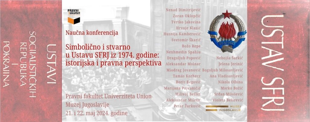 Pravni fakultet Univerziteta Union u Beogradu i Muzej Jugoslavije zajednički organizuju konferenciju Simbolično i stvarno u ustavu SFRJ iz 1974. godine: istorijska i pravna perspektiva. Konferencija će biti održana 21. i 22. maja 2024. godine. Prvog dana učesnike i goste konferencije očekujemo u Muzeju Jugoslavije (Mihaila Mike Jankovića 6), a drugog dana u prostorijama Pravnog fakulteta […]