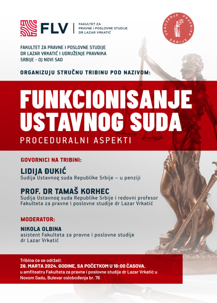FLV i Udruženje pravnika Srbije organizuju stručnu tribinu ,,FUNKCIONISANJE USTAVNOG SUDA – proceduralni aspekti“, 26. marta 2024. godine u 18:00 časova, FLV, Bulevar oslobođenja 76, Novi Sad.