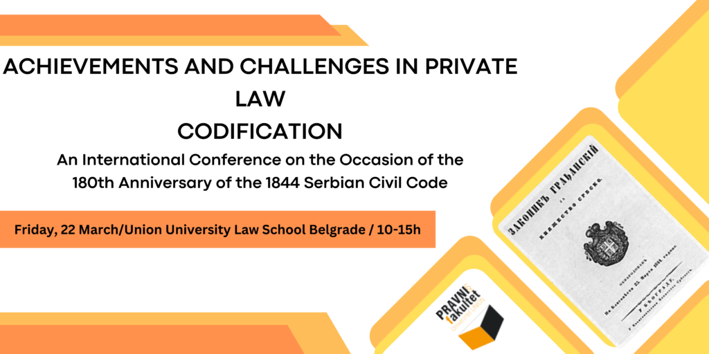 It is our pleasure to invite you to the Achievements and Challenges in Private Law Codification international scholarly conference organized on the occasion of the 180th Anniversary of the 1844 Civil Code of Serbia. The Conference will be held in the Middle Hall on the first floor of the Union University Law School Belgrade, Serbia, on Friday, 22 March […]