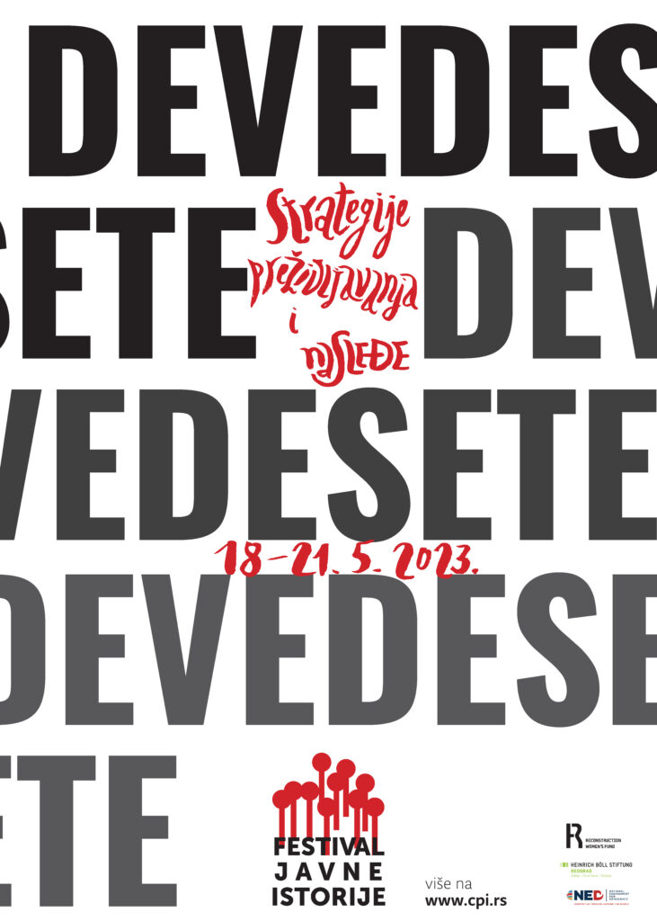 U periodu od 18. do 21. maja 2023. godine Centar za primenjenu istoriju organizuje u Beogradu drugi Festival javne istorije „Devedesete: Strategije preživljavanja i nasleđe“. Želja nam je da kroz festival otvorimo prostor za kritičko promišljanje naše nedavne prošlosti i nasleđa devedesetih godina prošlog veka, kao i načina na koji ova dekada i dalje oblikuje današnjicu. Otvaranje Festivala predviđeno […]