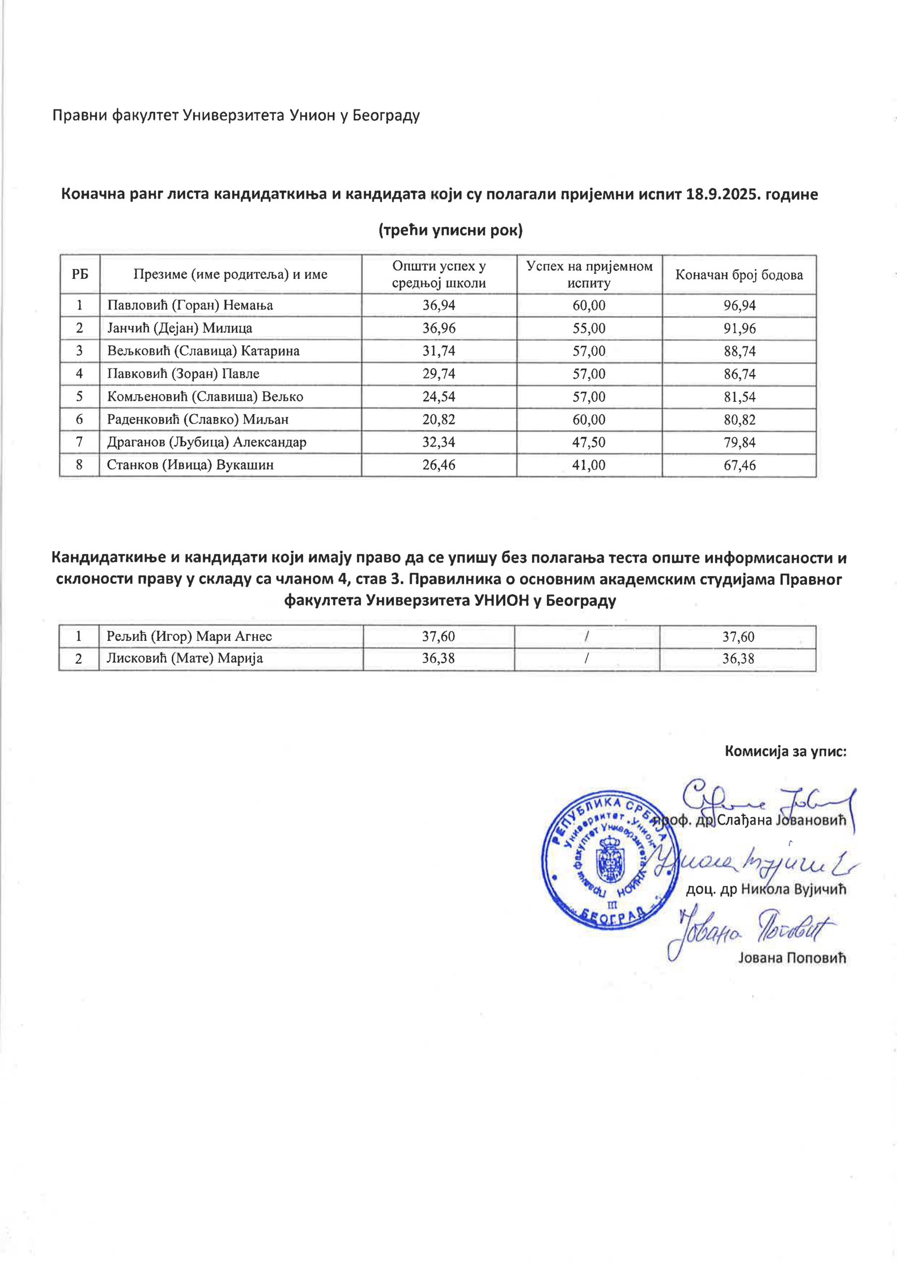 Konačna rang lista prijemnog ispita održanog 18. 9. 2025.