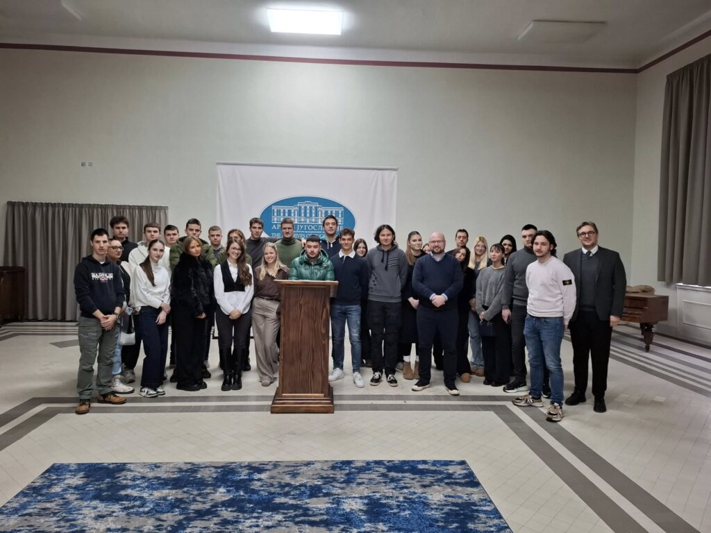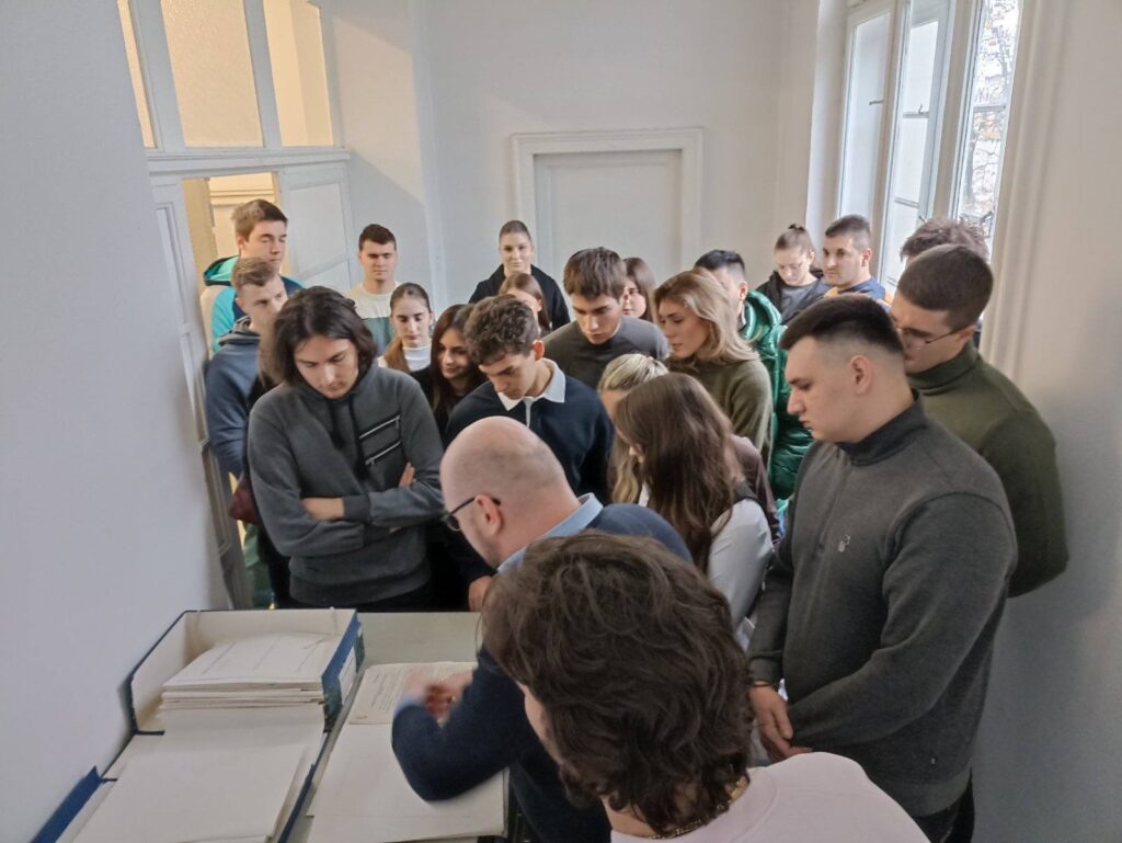 Studentkinje i studenti prve godine našeg fakulteta, zajedno sa profesorom Srđanom Miloševićem, posetili su 27. novembra 2025. godine Arhiv Jugoslavije u okviru nastave iz predmeta Istorija države i prava. Poseta je predstavljala dragocenu priliku da se neposredno upozna mesto u kom se čuva jedan od najznačajnijih delova institucionalnog istorijskog pamćenja, kao i temeljni materijal za istraživanje savremene pravne istorije.