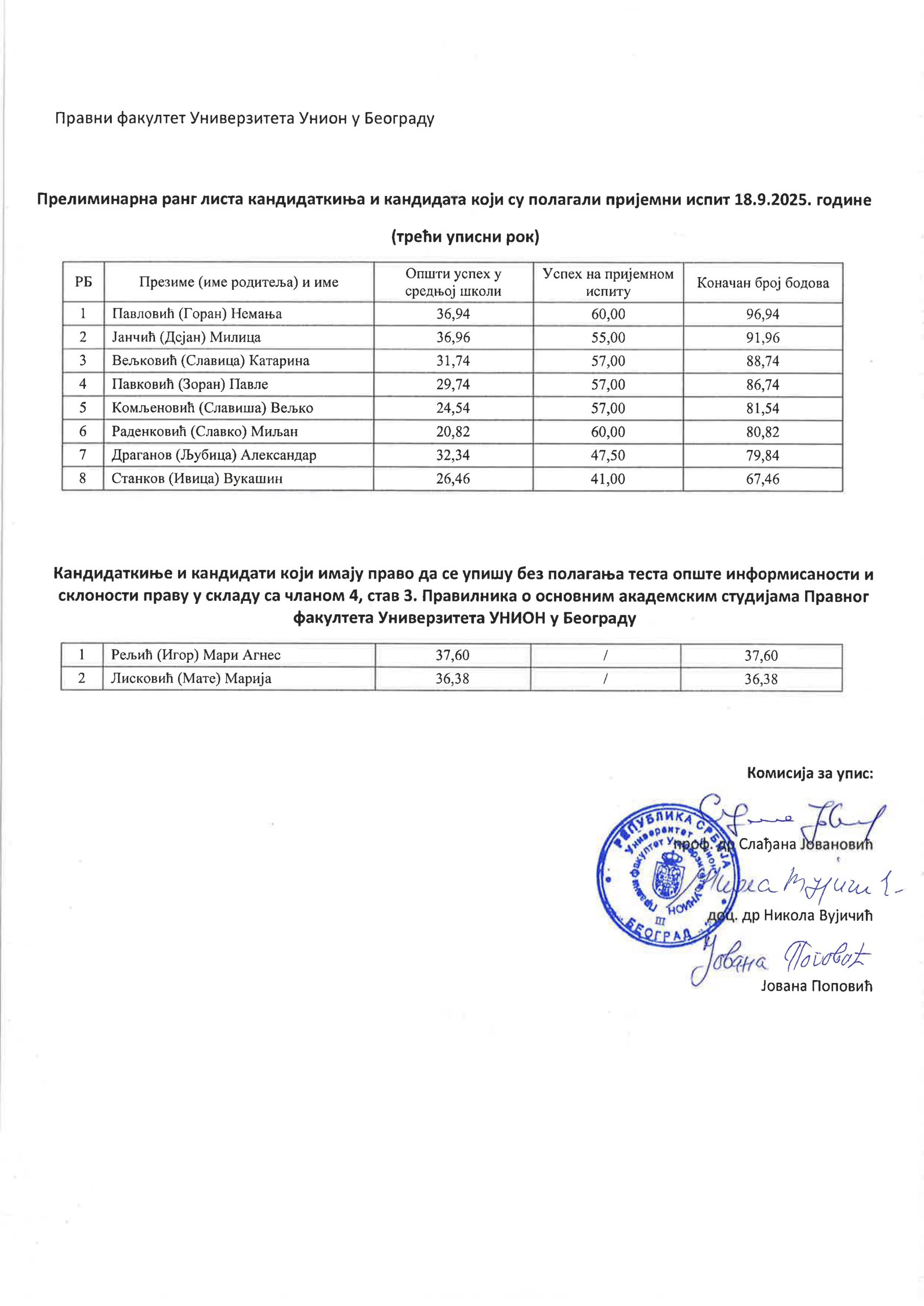 Preliminarna rang lista prijemnog ispita održanog 18. 9. 2025.