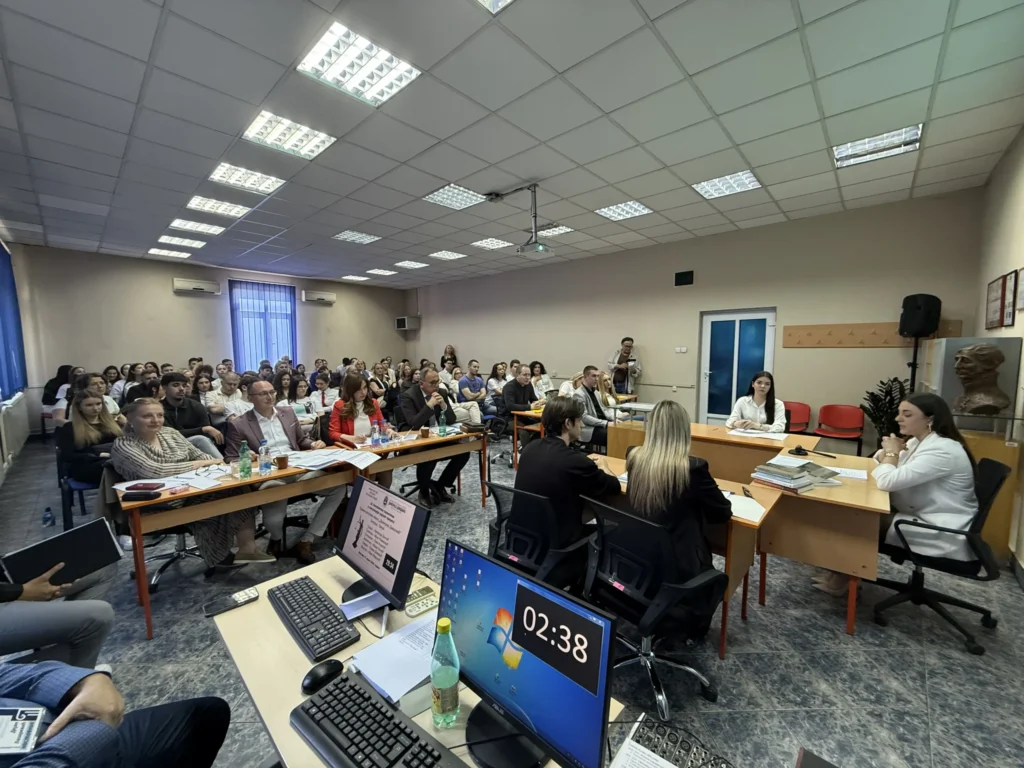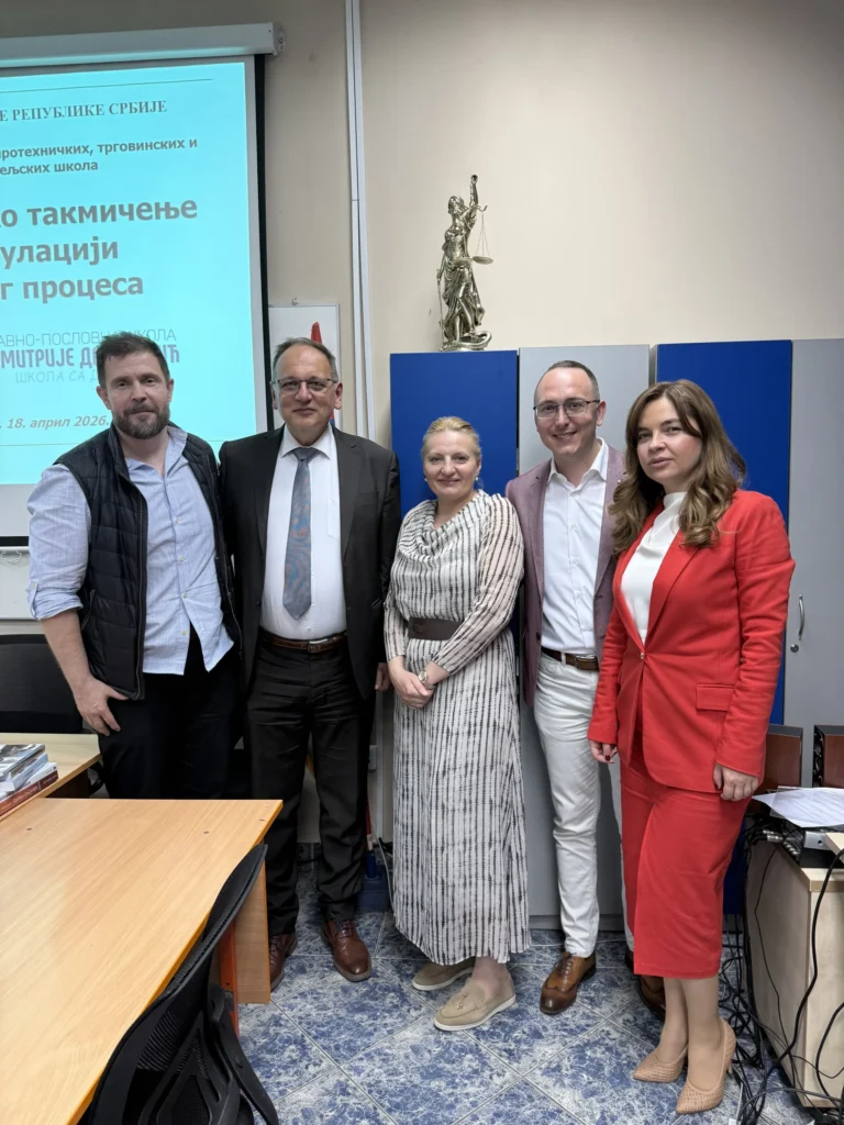 U subotu 18. aprila 2026. godine u srednjoj pravno-poslovnoj školi “Dimitrije Davidović” u Zemunu, održano je republičko takmičenje srednjih škola u simulaciji sudskog procesa. Naše kolege, doc. dr Nikola Vujičić i doc. dr Aleksandar Trešnjev, sudija Višeg suda u Beogradu su, uz dr Svetlanu Nenadić, javnog tužioca u Prvom osnovnom javnom tužilaštvu u Beogradu i Angelinu Obradović, advokaticu iz Beograda, bili članovi četvoročlanog žirija koji je ocenjivao takmičarske ekipe.